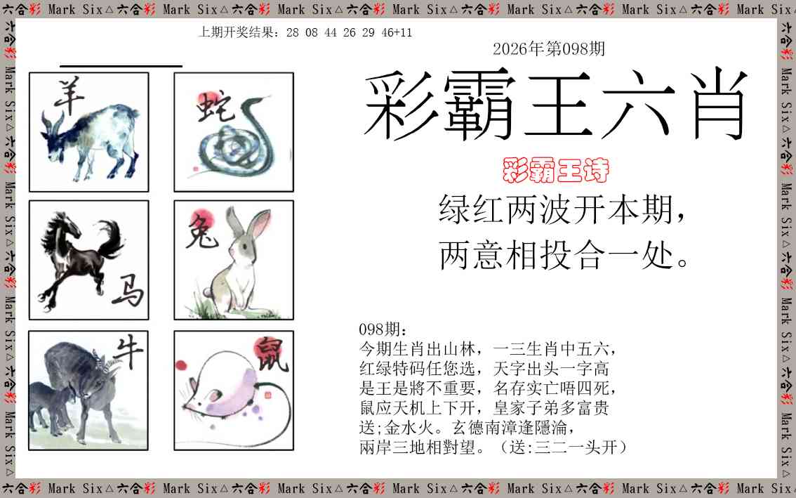 096期:九肖【马猴龙鼠羊虎牛狗蛇】开: